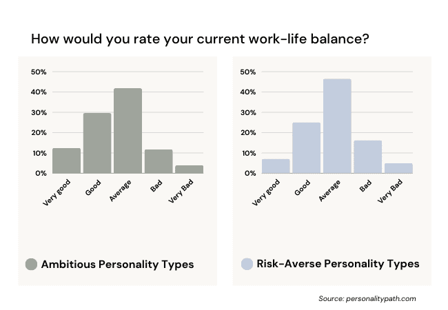 - Work-Life Balance Satisfaction: 30% satisfaction among typically labeled “high achieving” personality types, and personalities that are motivated by career and advancement. In contrast, persons categorized as more cautious, pessimistic, or insecure feel a decrease in work-life balance.