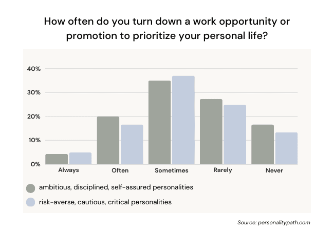 Ambitious, instinctual, and spontaneous personality types are notably characterized by their inclination to never turn down work opportunities in favor of prioritizing personal life (18.7%). This suggests a prevailing ethos of dedication to professional responsibilities within this subset of the workforce.