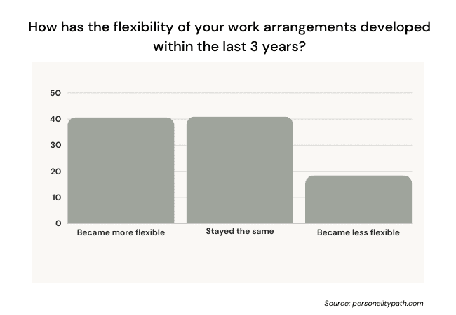 For spontaneous, independent, and headstrong personality types, the consensus points toward an improvement in productivity resulting from the increased flexibility in work arrangements. This positive correlation suggests that, for these subsets of the workforce, adaptability has translated into heightened efficiency and output.