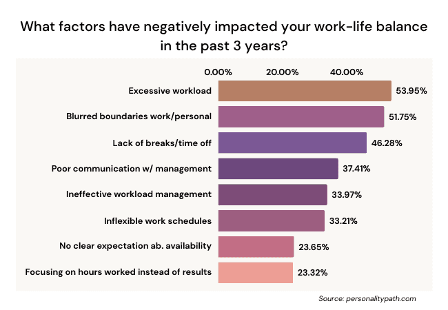The survey results on negative factors impacting work-life balance in the last three years highlight a common concern across all personality types: an excessive workload and the blurring of boundaries between work and personal life. This prevailing issue notably affects professionals across outgoing, ambitious, and disciplined personality types (29.3%).