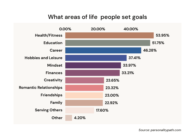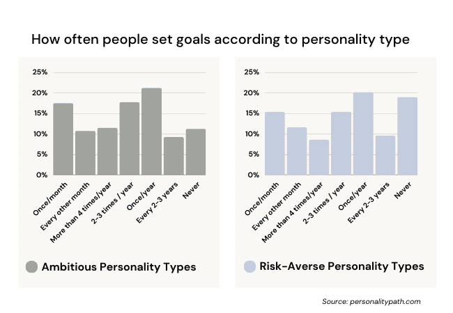 Individuals who are highly motivated, outgoing and risk-prone, set new goals more frequently (more than 4 times a year), whereas more methodical, risk-averse and indecisive personalities tend to set fewer goals for themselves from the get-go. 23.8% of cautious and less confident personality types indicated they never set goals at all, whereas only 5% of risk-prone and confident personality types answered “Never”, showing it’s 5 times more likely for protective, cautious, and risk-averse personality types to avoid setting any goals compared to optimistic, self-assured, and trusting personality types. The majority of people asked in the study are content to set goals once or 2-3 times a year (28%).