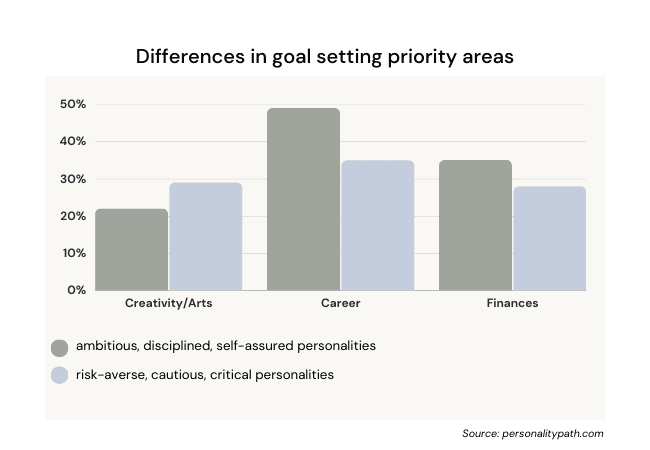 We asked people about the areas in which they typically set their goals, talking about their personal focus and area of motivation (for example career driven vs. relationship focused). Extroverted, ambitious, and competitive personalities reported a strong focus on career-related goals (49%), while pessimistic, self-critical or more cautious personality types show less interest in career goals (35%).