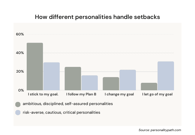 The study also provides insights into how different personalities deal with setbacks. 51% of highly ambitious and decisive personalities, as well as the methodical personality types, tend to stick to their strategies, even when faced with obstacles. In contrast, 30% of participants with more indecisive, skeptic, and self-critical personality traits noted that they are quick to let go of their original plans or even their entire goal. Non-competitive and risk-averse personality types (22%) are particularly inclined to change their approaches.