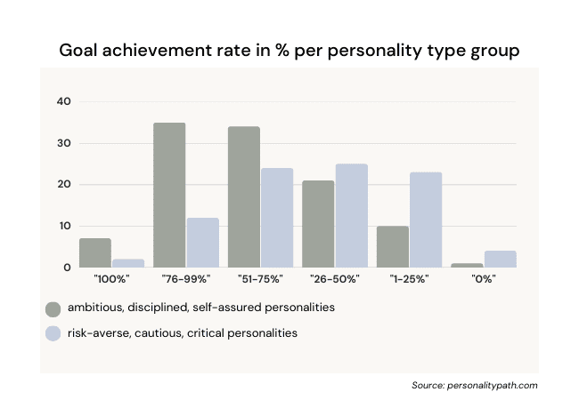 The study reveals that the majority of participants achieve between 51-75% of their goals, with self-critical types typically achieving less than 50% of their goals, and highly ambitious and optimistic personality types, as well as methodical and reliant personalities achieve more than half of what they set out to achieve. It’s worth noting that 7% of ambitious and confident personality types indicated that reaching 100% of their goals was natural, which is 7 times as high as cautious, risk-averse and overthinking personality types. Vice versa, 5% of these less ambitious, and risk-averse types admit to reaching 0% of their goals, compared to only 1% of self-assured and ambitious types.